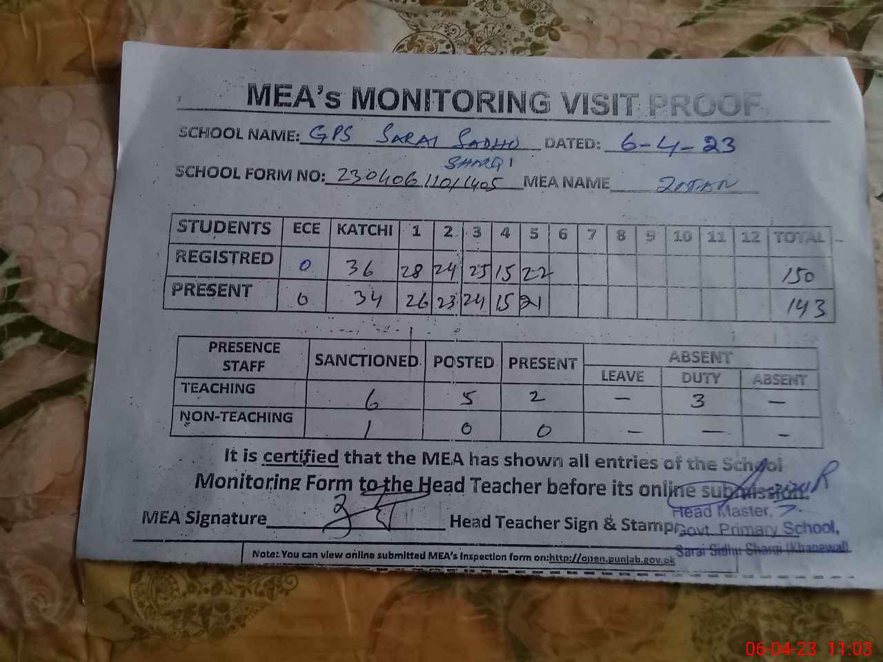 | Attendance Register | Head Teacher | MEA with School | Visit Proof |