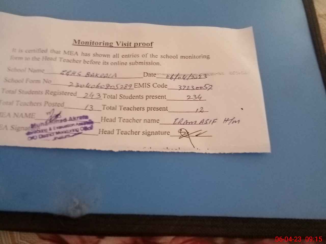 | Attendance Register | Head Teacher | MEA with School | Visit Proof |