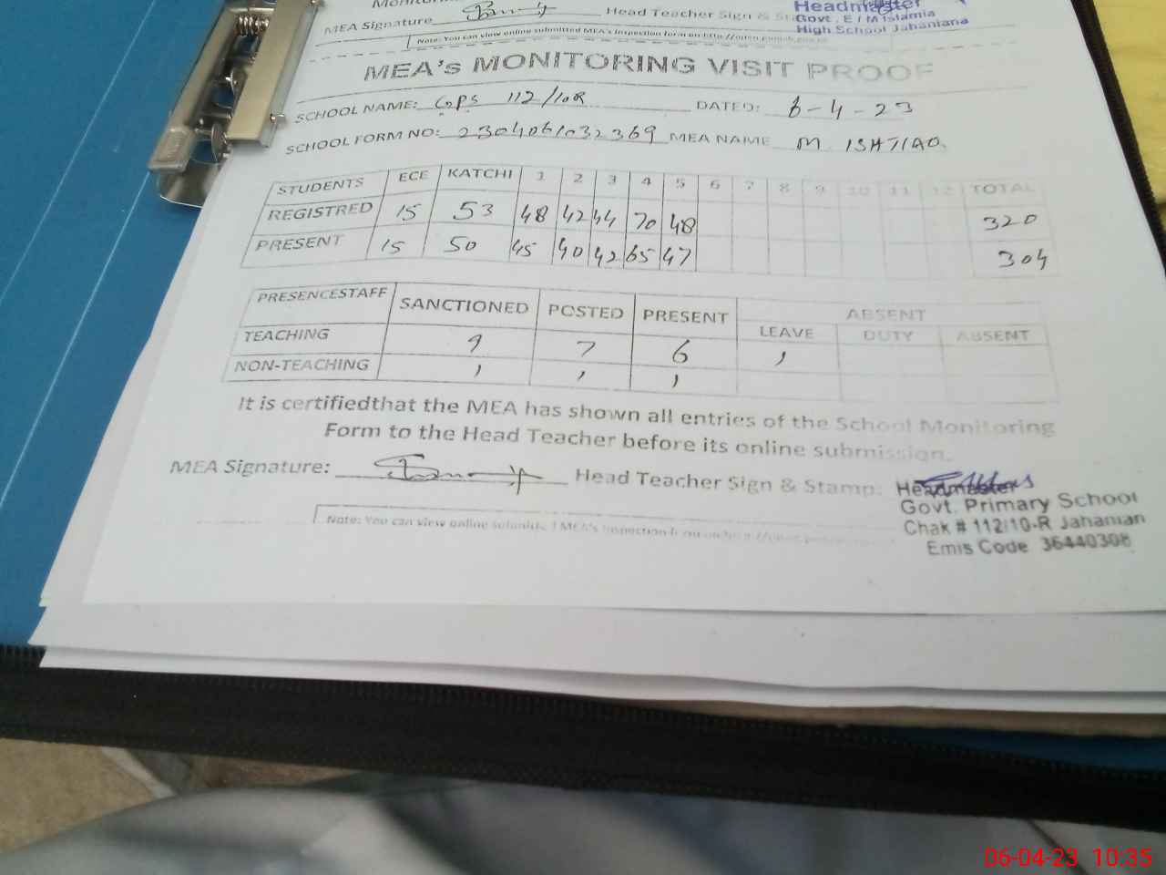 | Attendance Register | Head Teacher | MEA with School | Visit Proof |