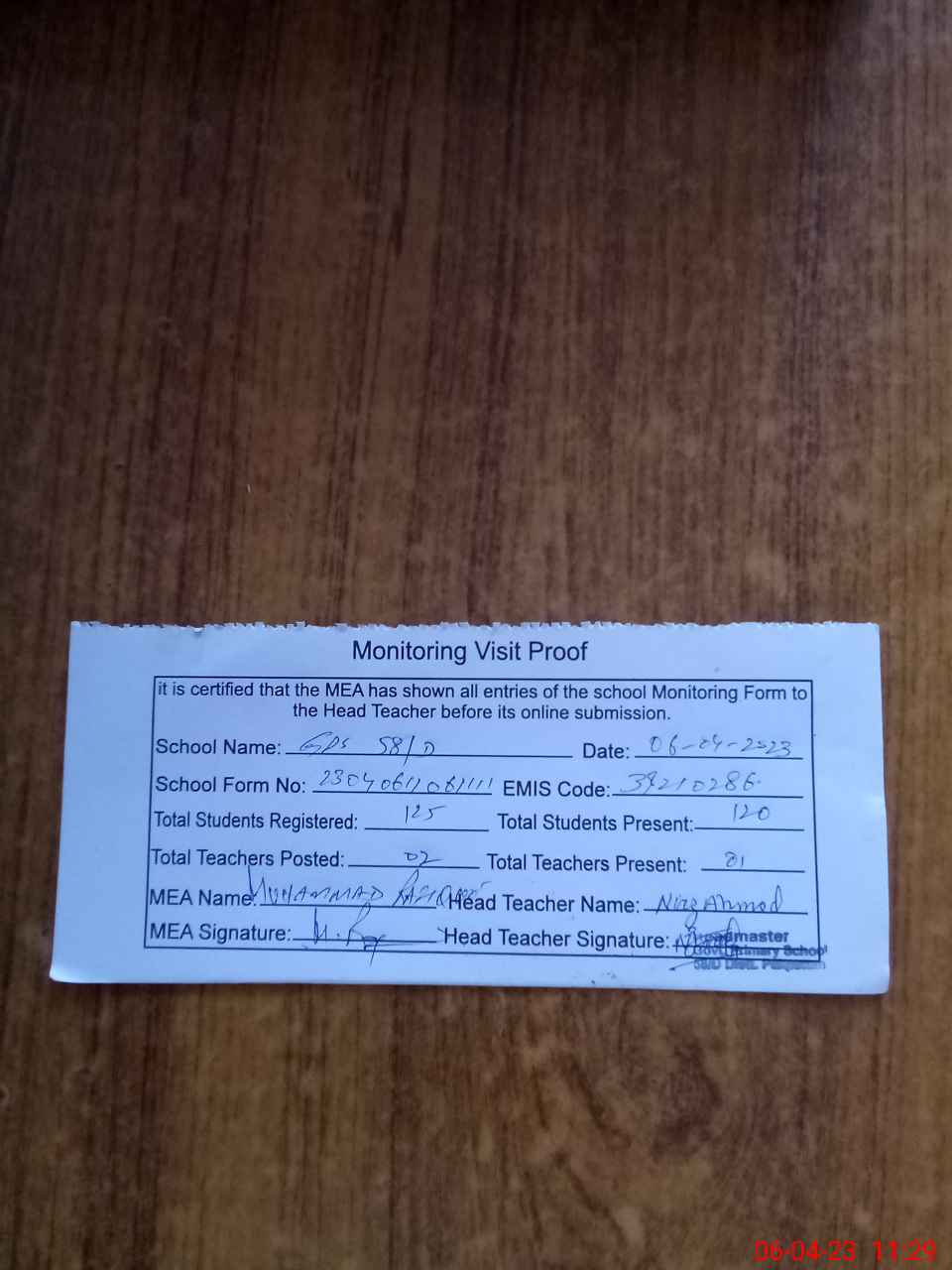 | Attendance Register | Head Teacher | MEA with School | Visit Proof |