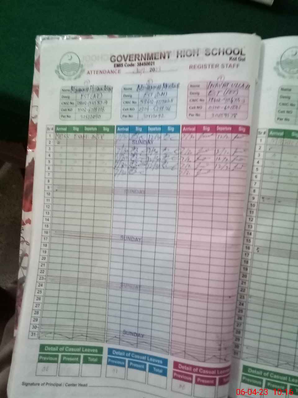 | CNIC | Full Name | Designation | R/C | Absence During Last Calender Month |