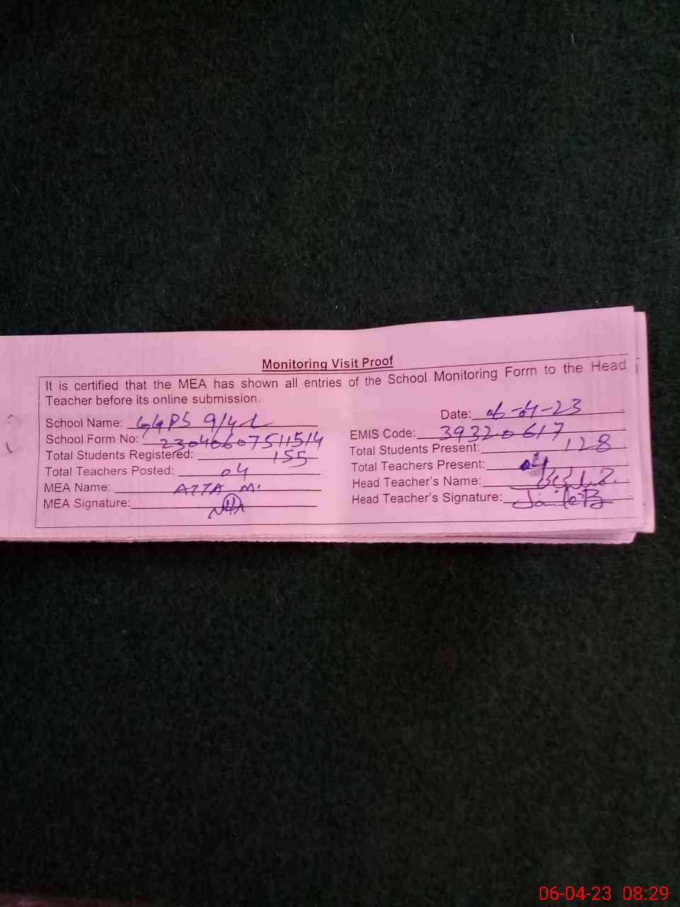 | Attendance Register | Head Teacher | MEA with School | Visit Proof |