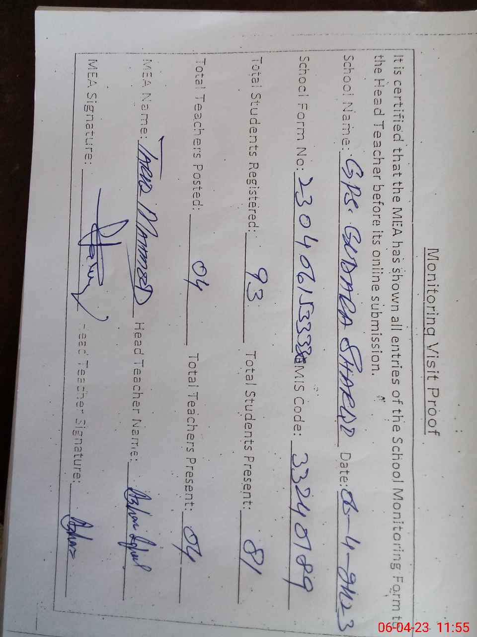 | Attendance Register | Head Teacher | MEA with School | Visit Proof |
