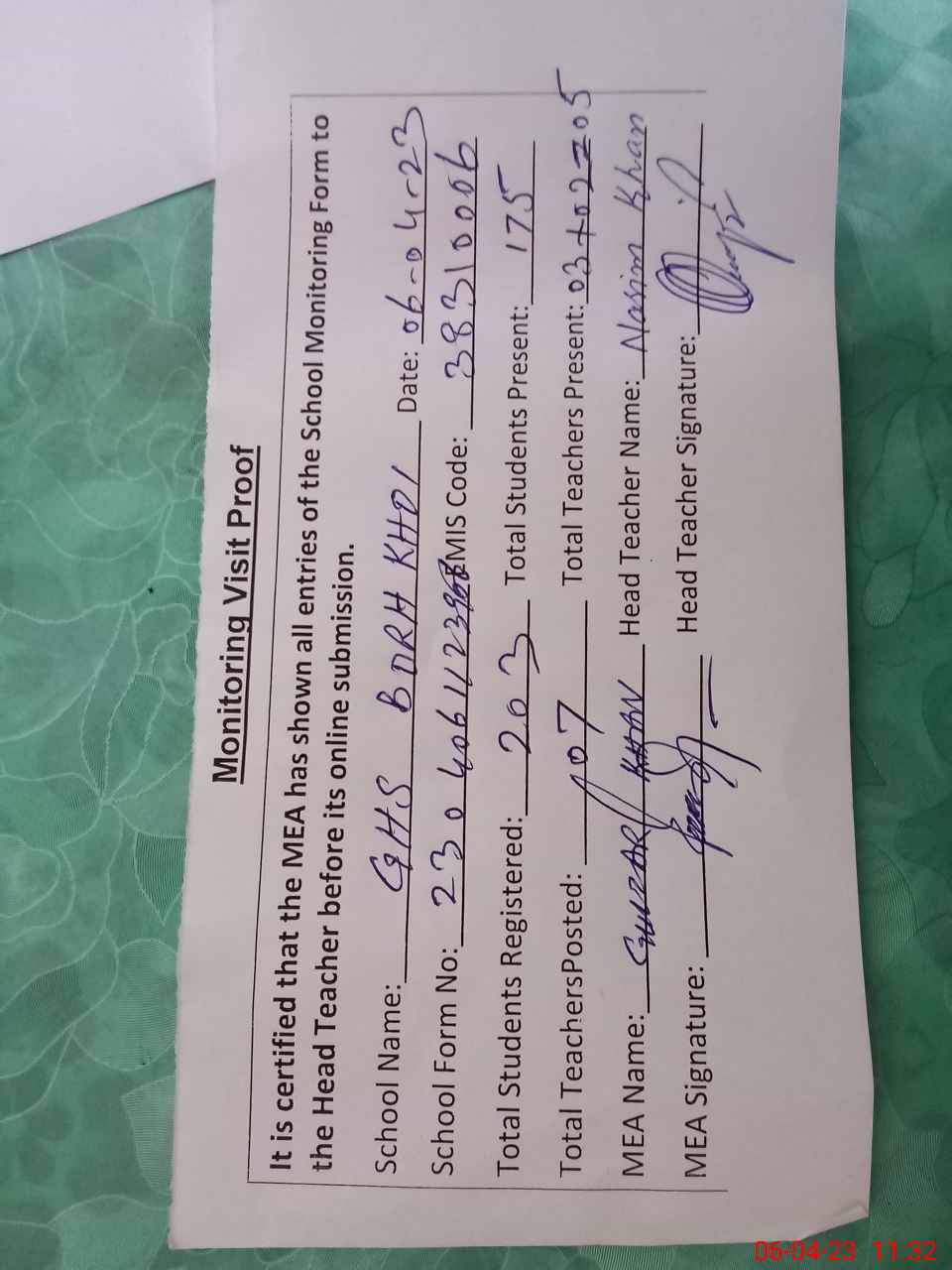 | Attendance Register | Head Teacher | MEA with School | Visit Proof |