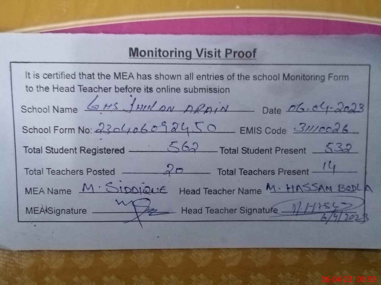 | Attendance Register | Head Teacher | MEA with School | Visit Proof |