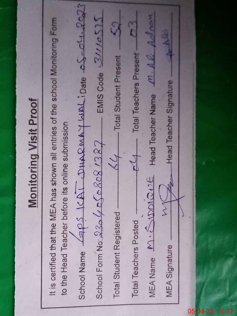 | Attendance Register | Head Teacher | MEA with School | Visit Proof |