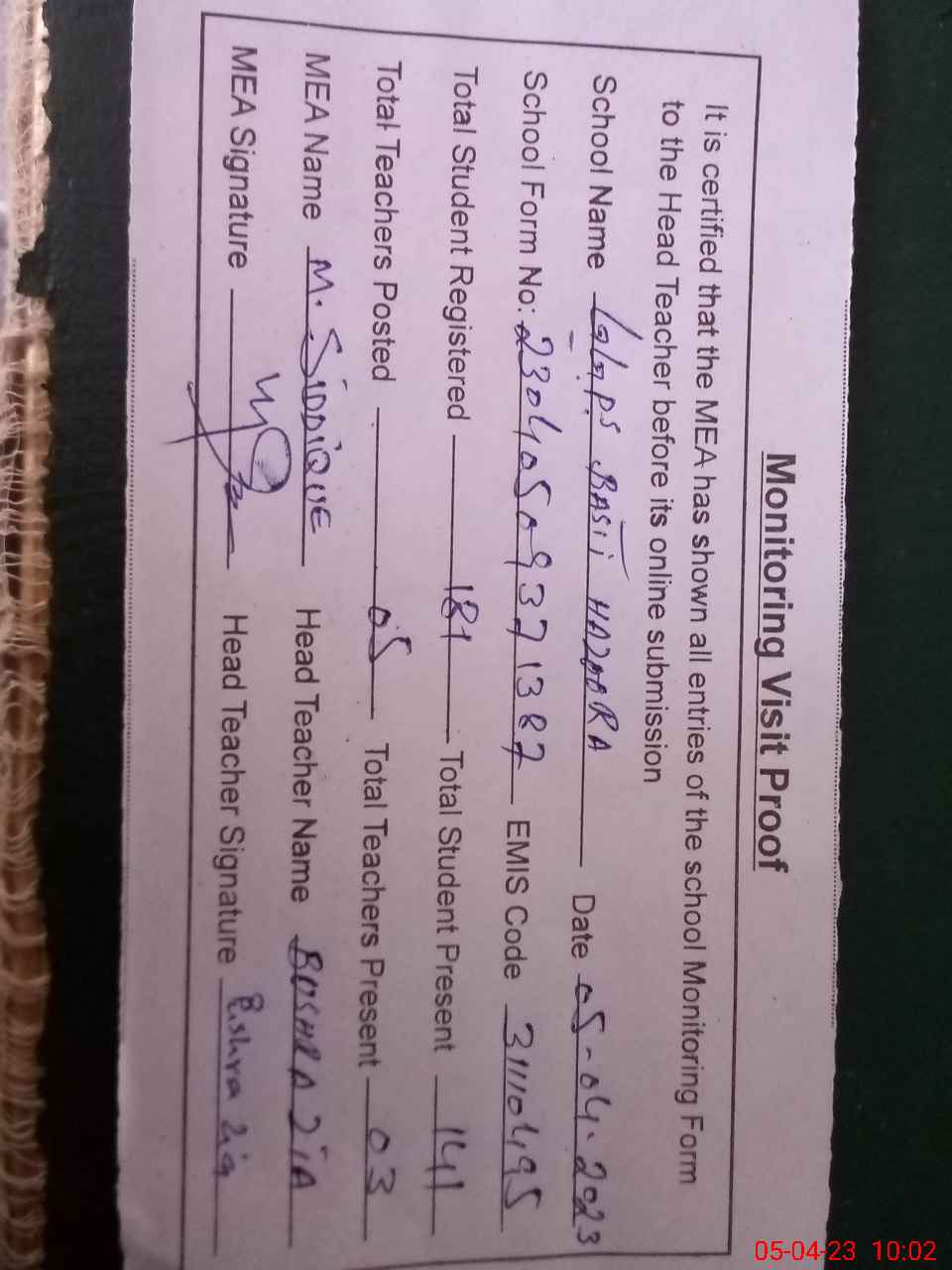 | Certified that this School was Inspected by the Undersigned MEA/DMO Today and the Information Stated Above is as Per Record. | |||||
