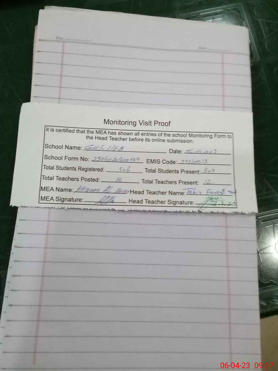 | Attendance Register | Head Teacher | MEA with School | Visit Proof |