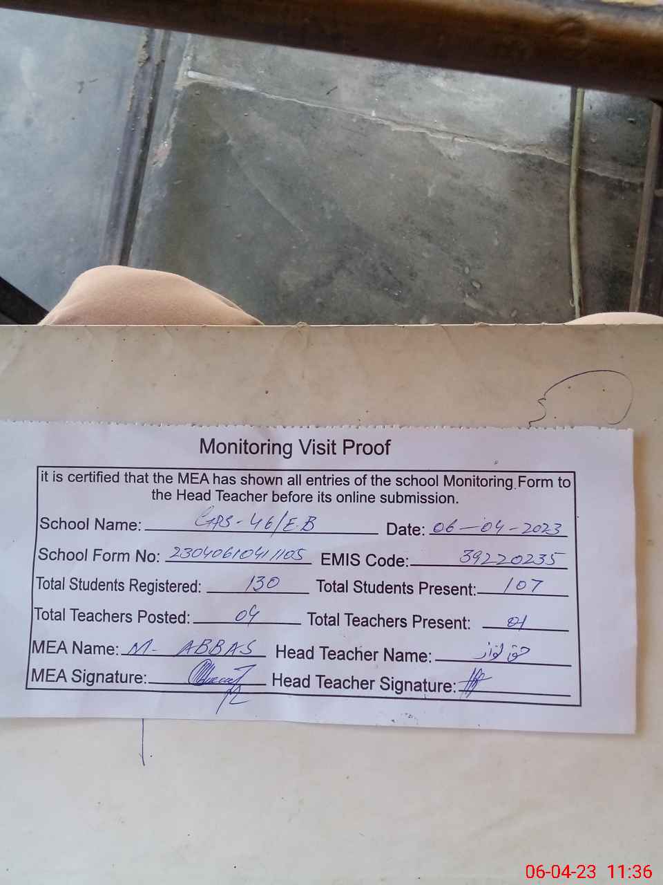 | Attendance Register | Head Teacher | MEA with School | Visit Proof |