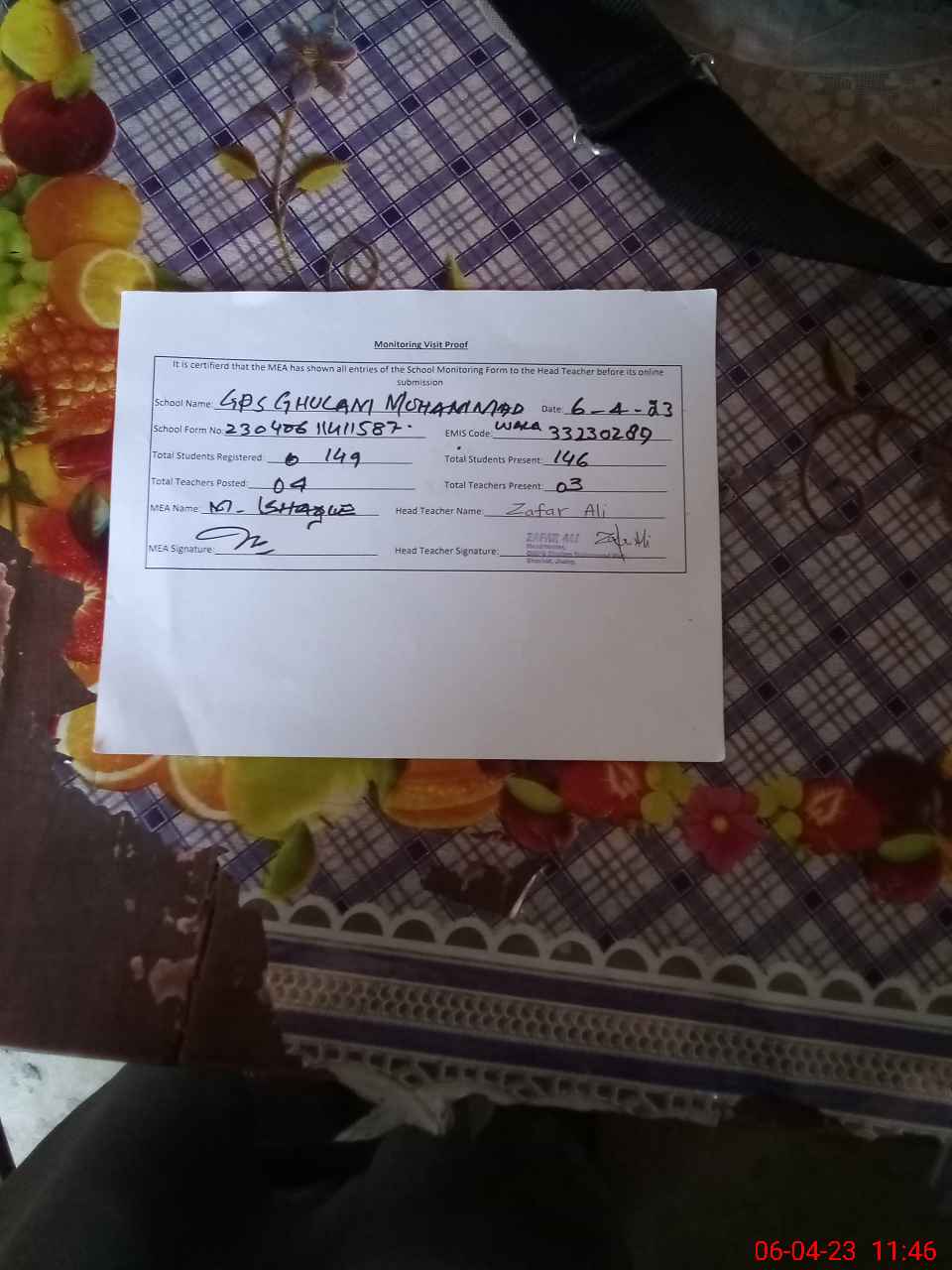 | Attendance Register | Head Teacher | MEA with School | Visit Proof |