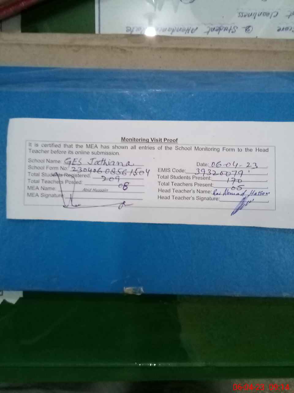 | Attendance Register | Head Teacher | MEA with School | Visit Proof |