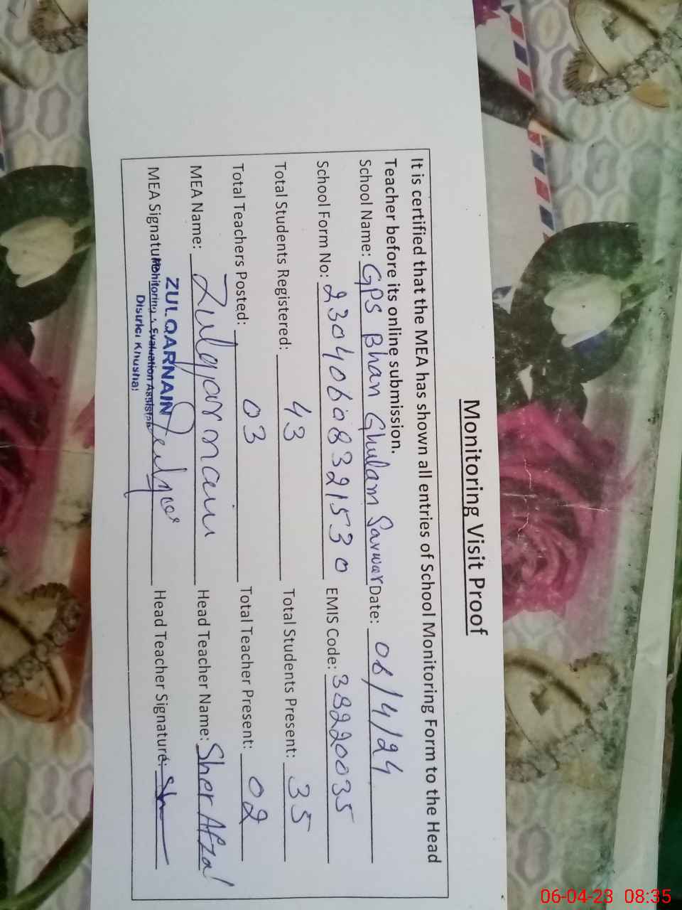 | EMIS Code: 38220035 | Name of School: GPS BHAN GHULAM SARWAR | |||