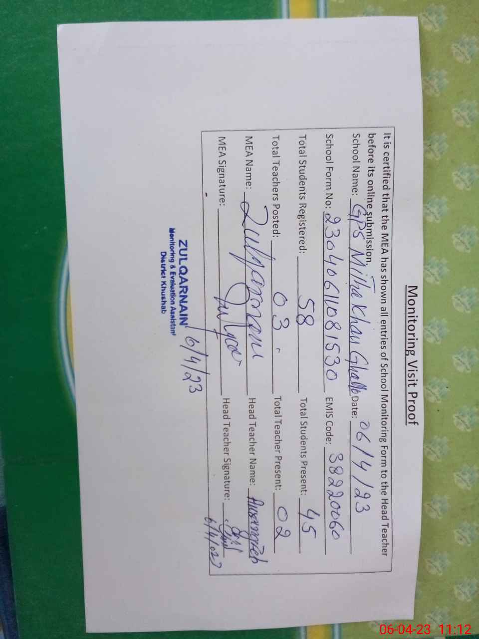 | Attendance Register | Head Teacher | MEA with School | Visit Proof |