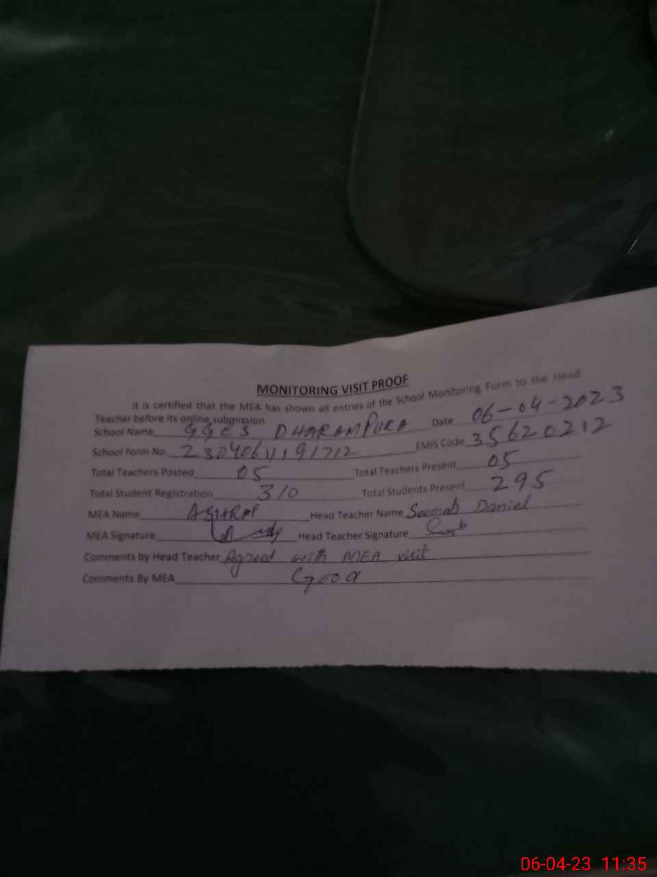 | Attendance Register | Head Teacher | MEA with School | Visit Proof |