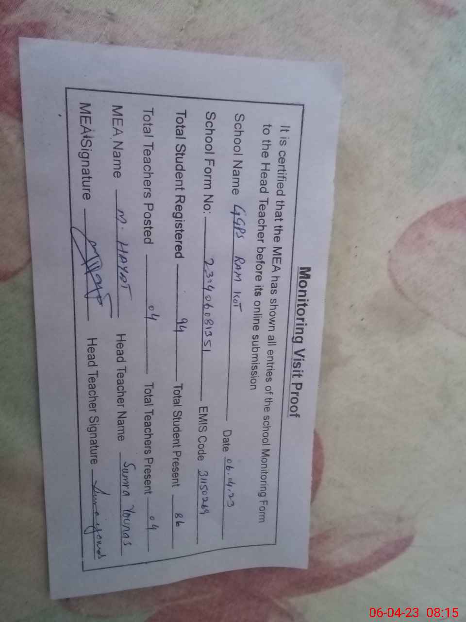 | Attendance Register | Head Teacher | MEA with School | Visit Proof |