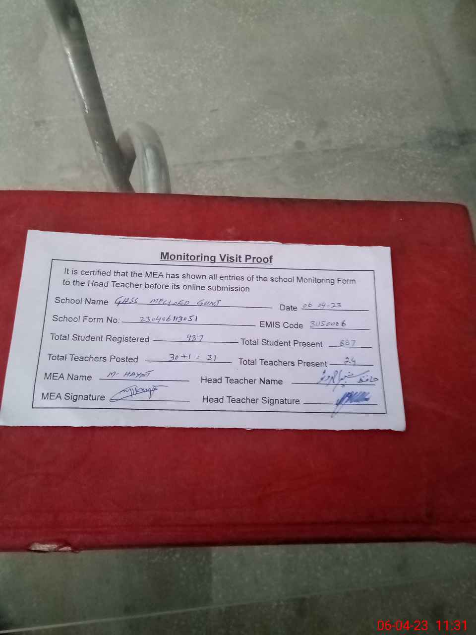 | Attendance Register | Head Teacher | MEA with School | Visit Proof |