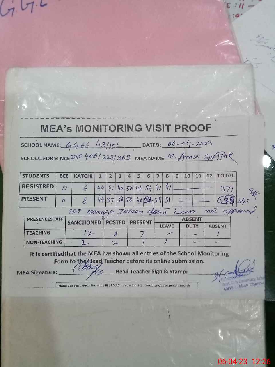 | Attendance Register | Head Teacher | MEA with School | Visit Proof |