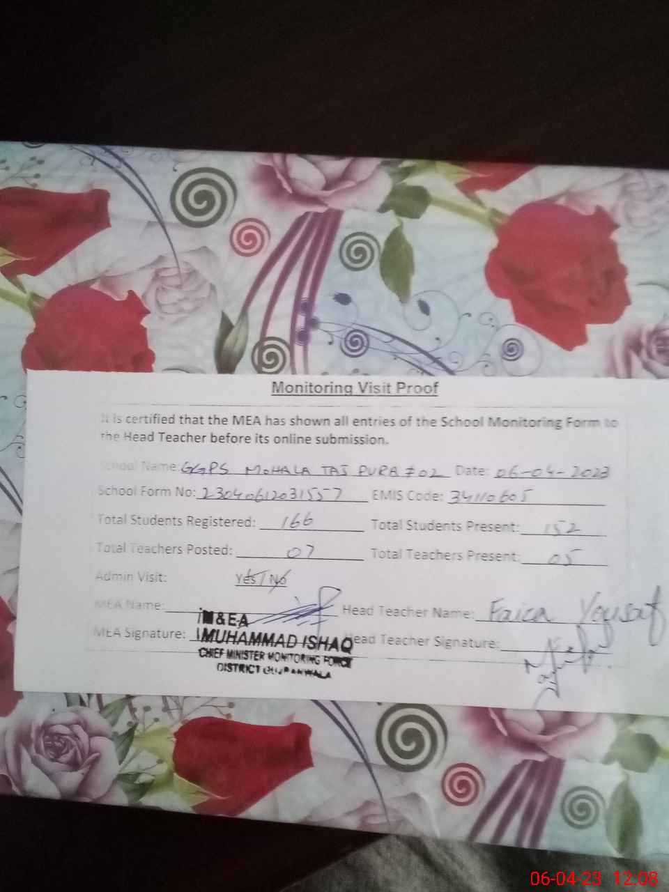 | Certified that this School was Inspected by the Undersigned MEA/DMO Today and the Information Stated Above is as Per Record. | |||||