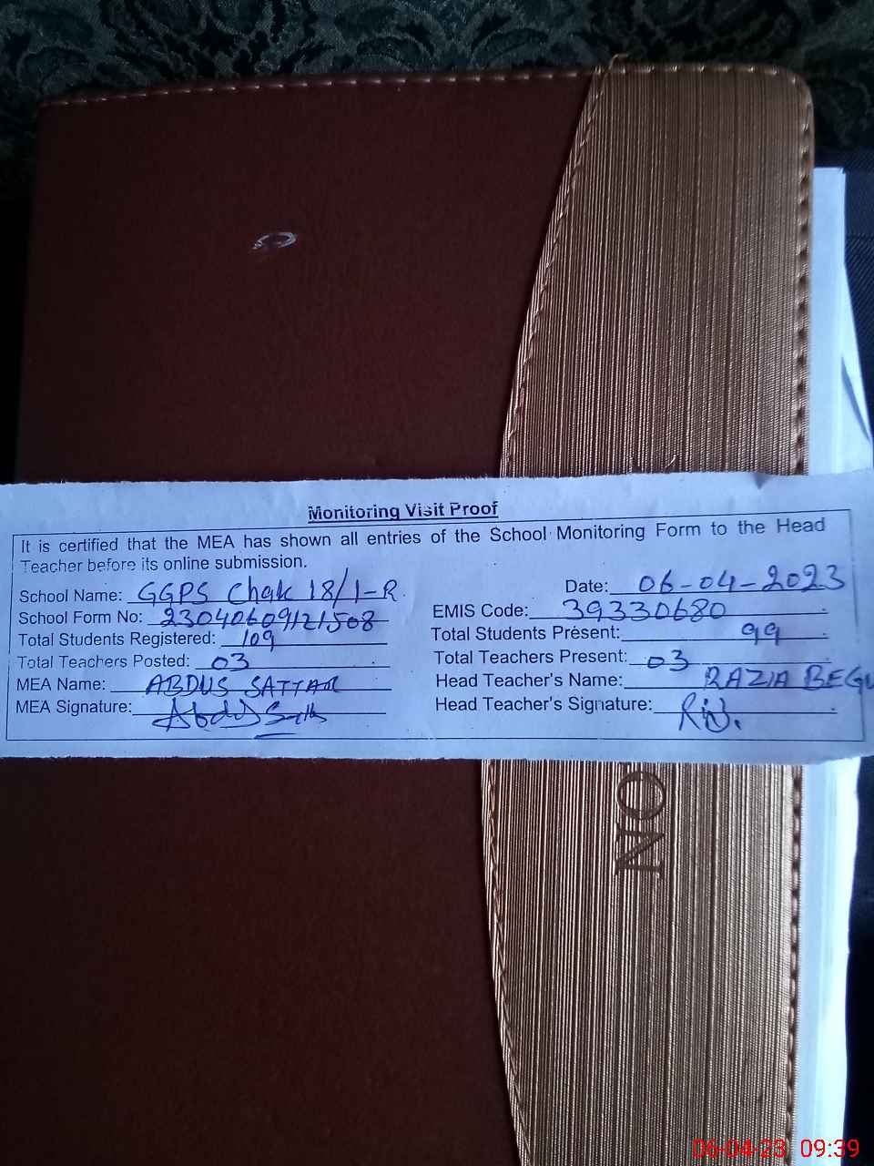 | Attendance Register | Head Teacher | MEA with School | Visit Proof |