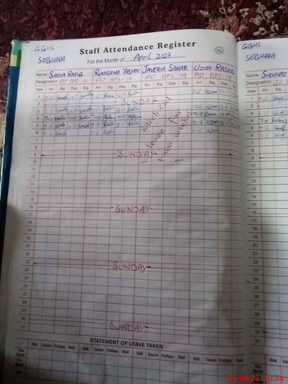 | Leave | Duty | Absent | Maternity | Medical | Ex- Pak |
