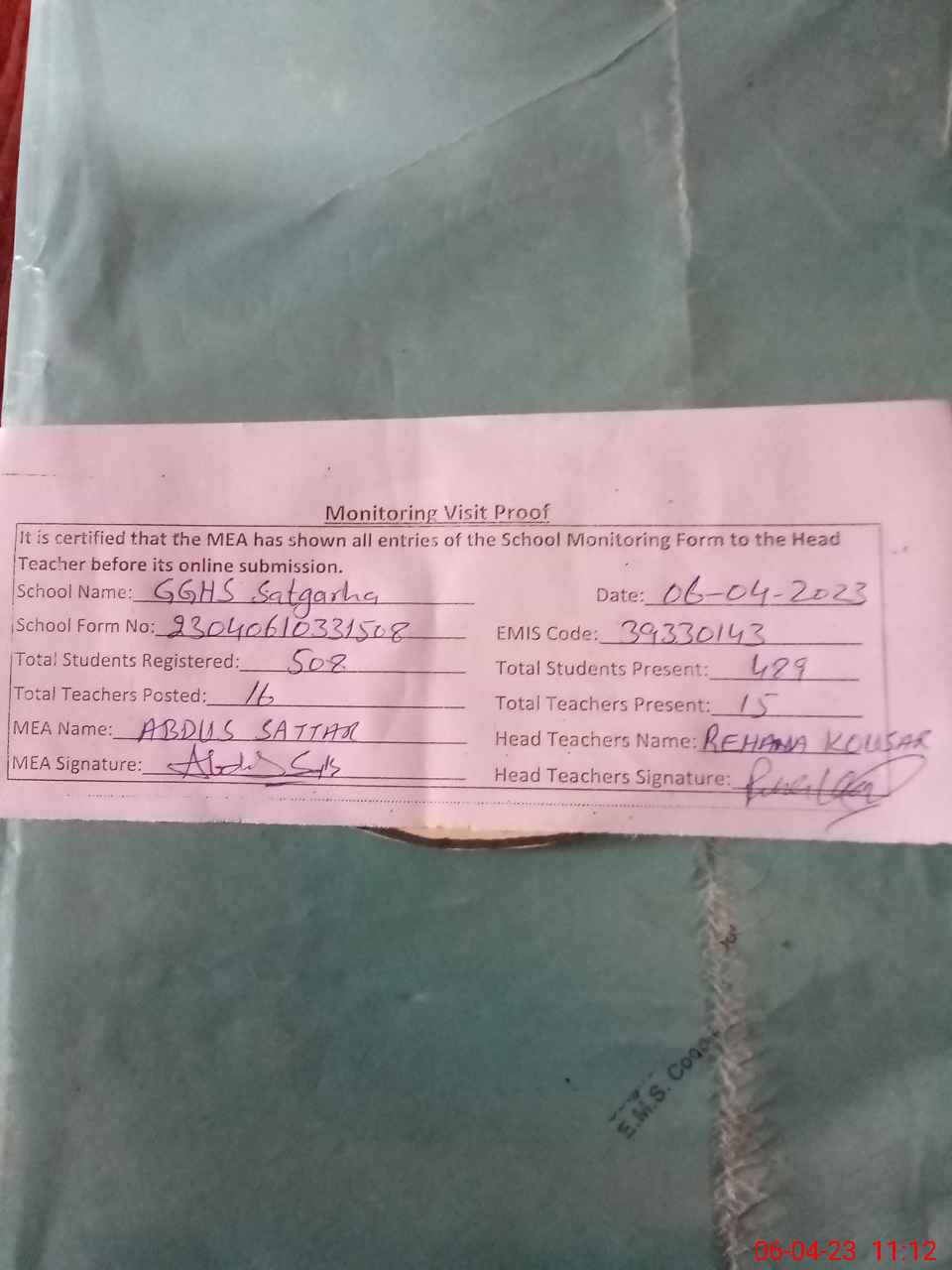 | Attendance Register | Head Teacher | MEA with School | Visit Proof |