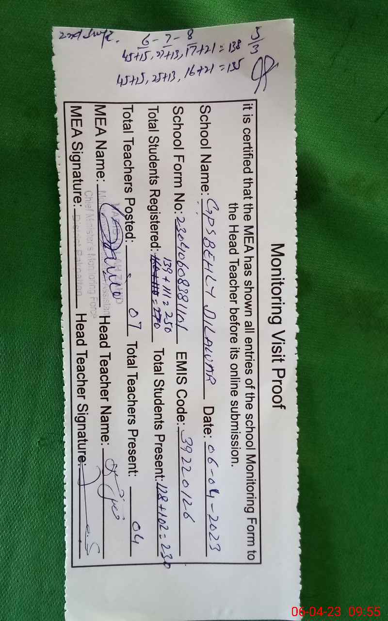 | Attendance Register | Head Teacher | MEA with School | Visit Proof |