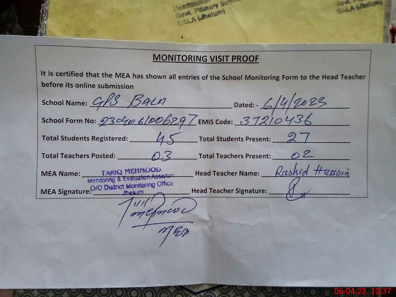 | Attendance Register | Head Teacher | MEA with School | Visit Proof |