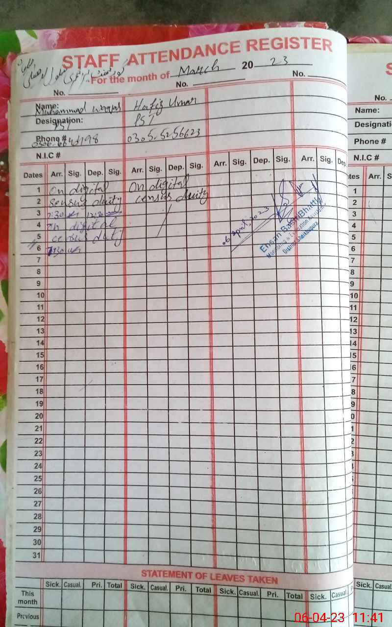 | CNIC | Full Name | Designation | R/C | Absence During Last Calender Month |