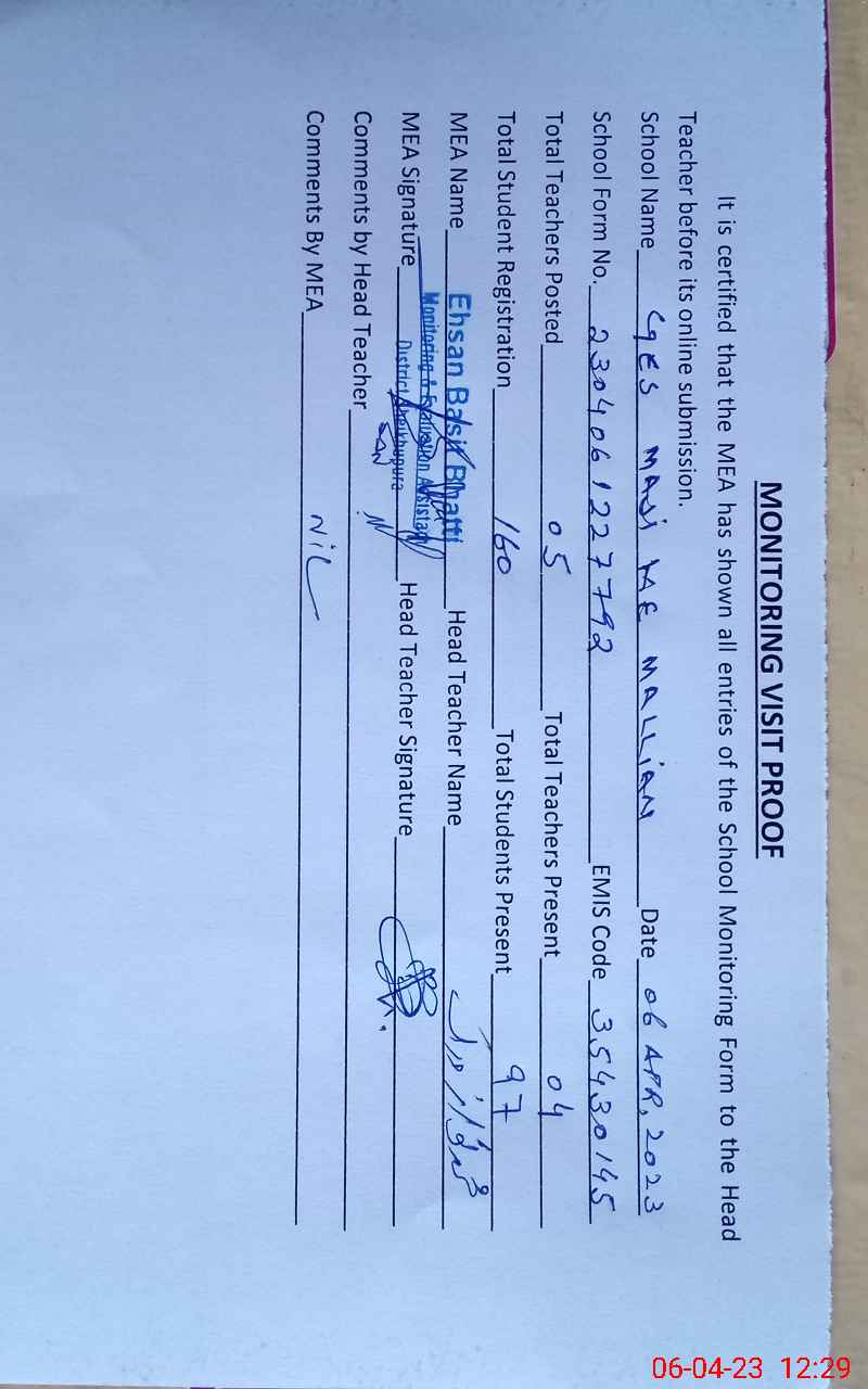 | Certified that this School was Inspected by the Undersigned MEA/DMO Today and the Information Stated Above is as Per Record. | |||||