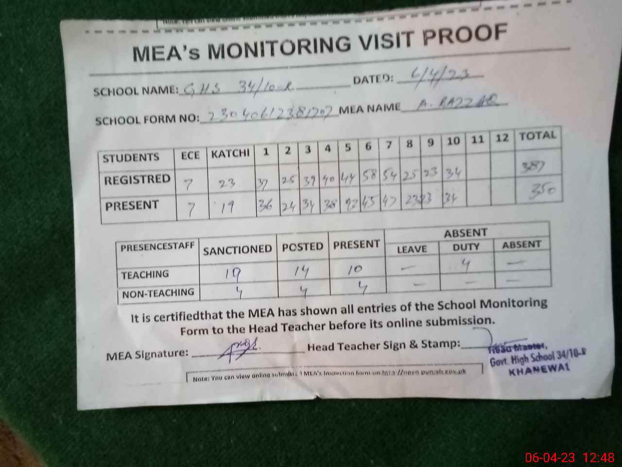 | Attendance Register | Head Teacher | MEA with School | Visit Proof |