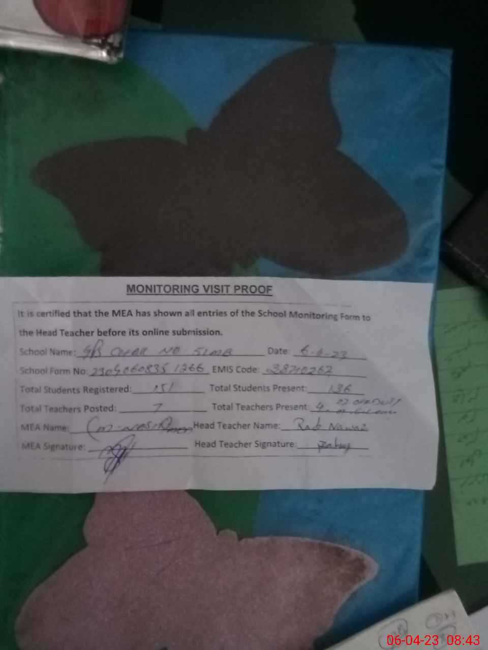| Attendance Register | Head Teacher | MEA with School | Visit Proof |