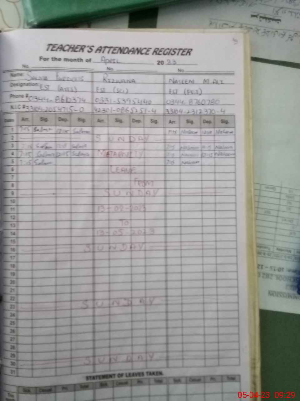 | Name: SA**** FI**** Designation: (School Headmaster's/Headmistress's) EST Phone/Cell Number: 03**** |
