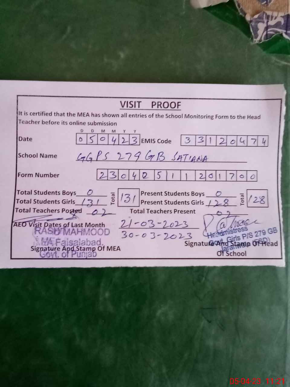 | EMIS Code: 33120474 | Name of School: GGPS CHAK 279 GB SATIANA | |||