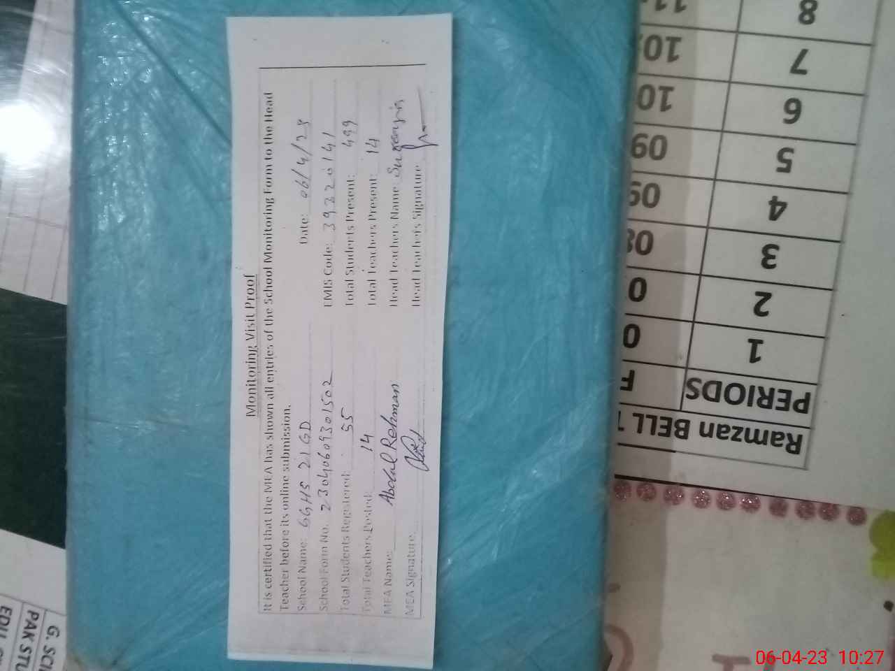 | Attendance Register | Head Teacher | MEA with School | Visit Proof |