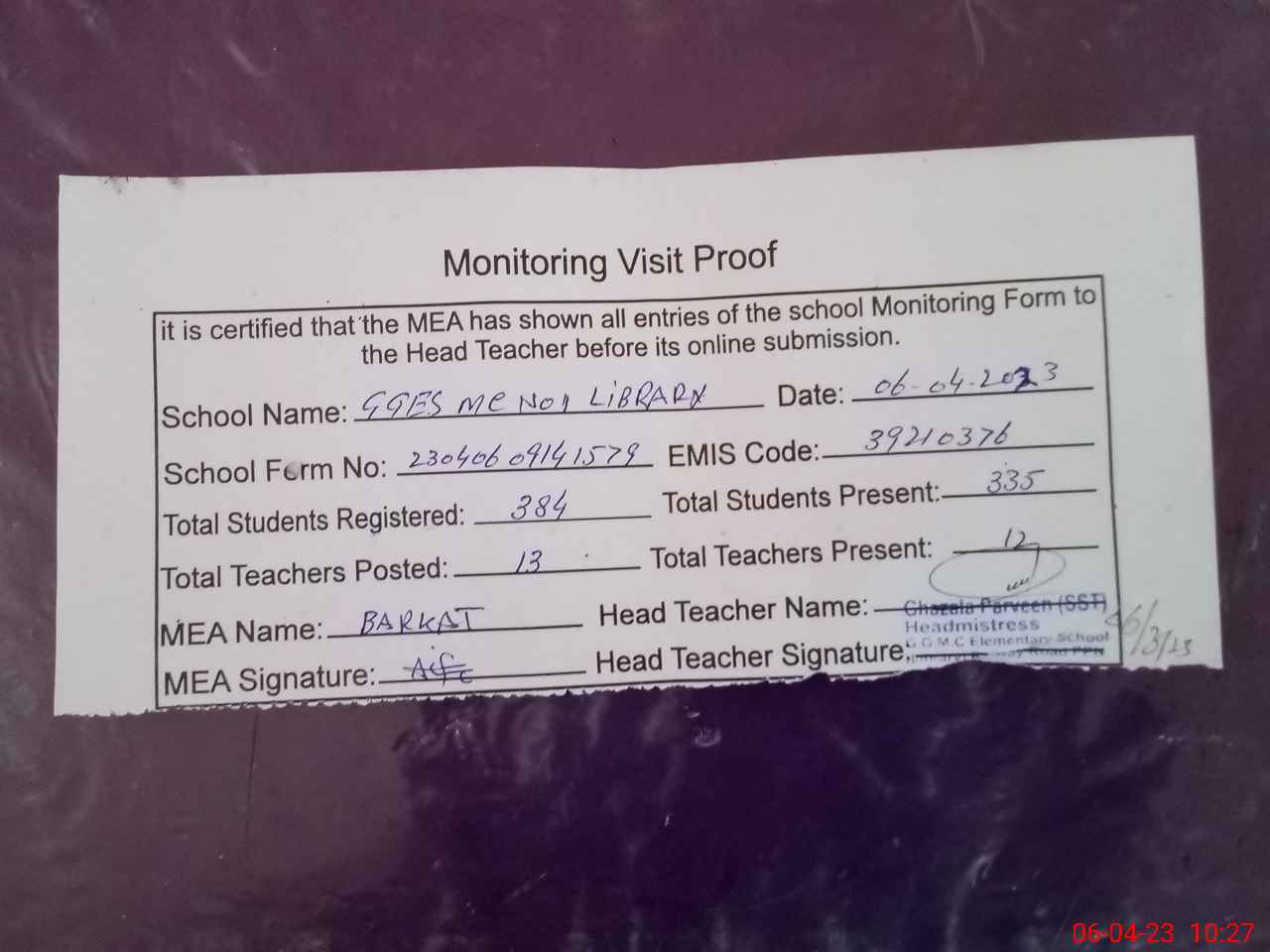 | Attendance Register | Head Teacher | MEA with School | Visit Proof |