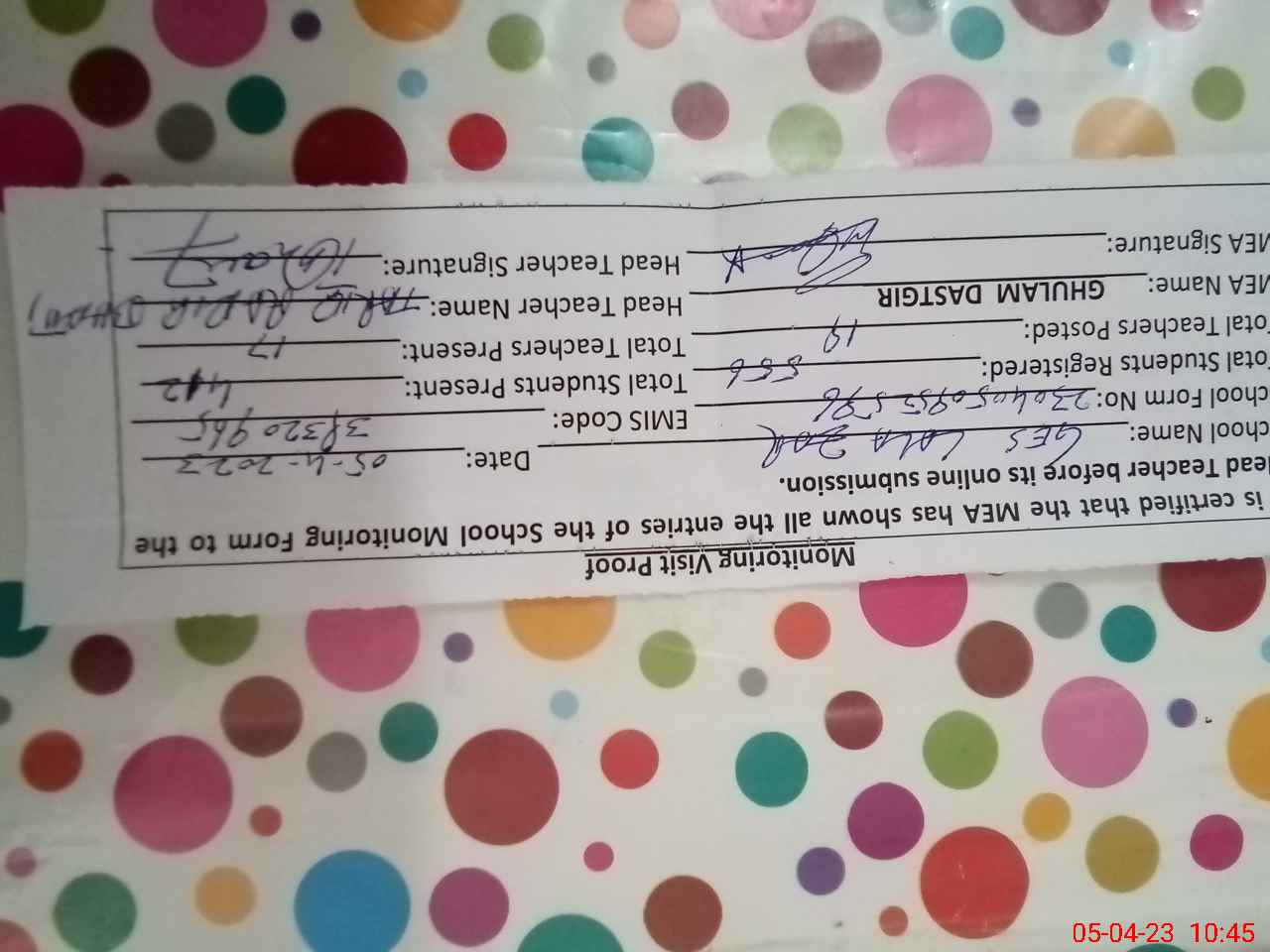 | Monitoring Date: 05-04-2023 | Start Time: 05-04-2023 09:52 AM | End Time: 05-04-2023 10:46 AM | Name of MEA: GH**** DA**** (R**** | |