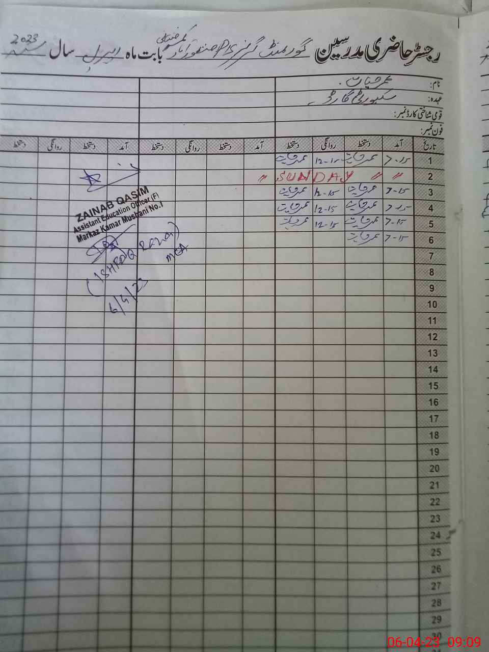 | Name: FO**** AZ**** Designation: (School Headmaster's/Headmistress's) PST Phone/Cell Number: 03**** |