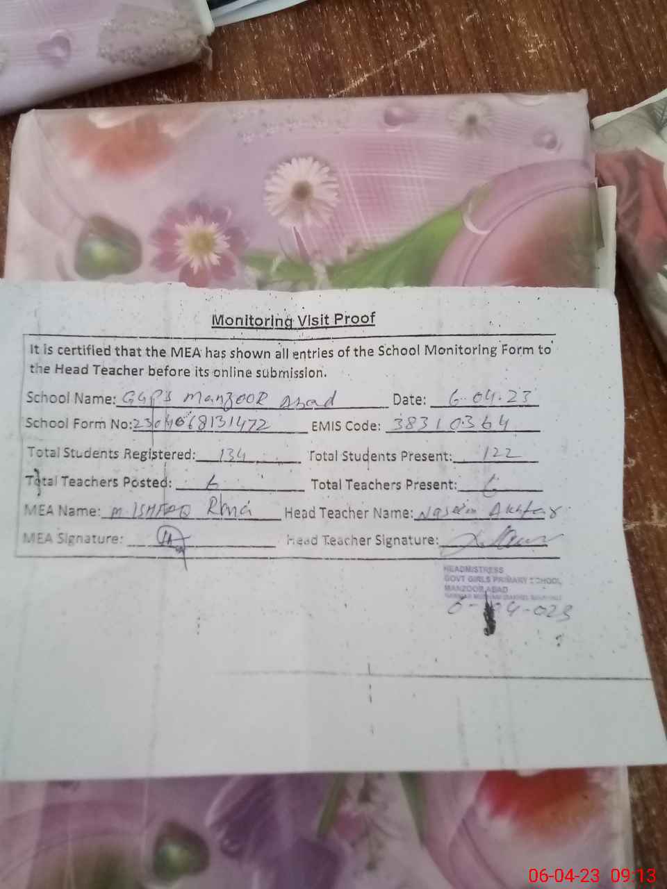 | Attendance Register | Head Teacher | MEA with School | Visit Proof |