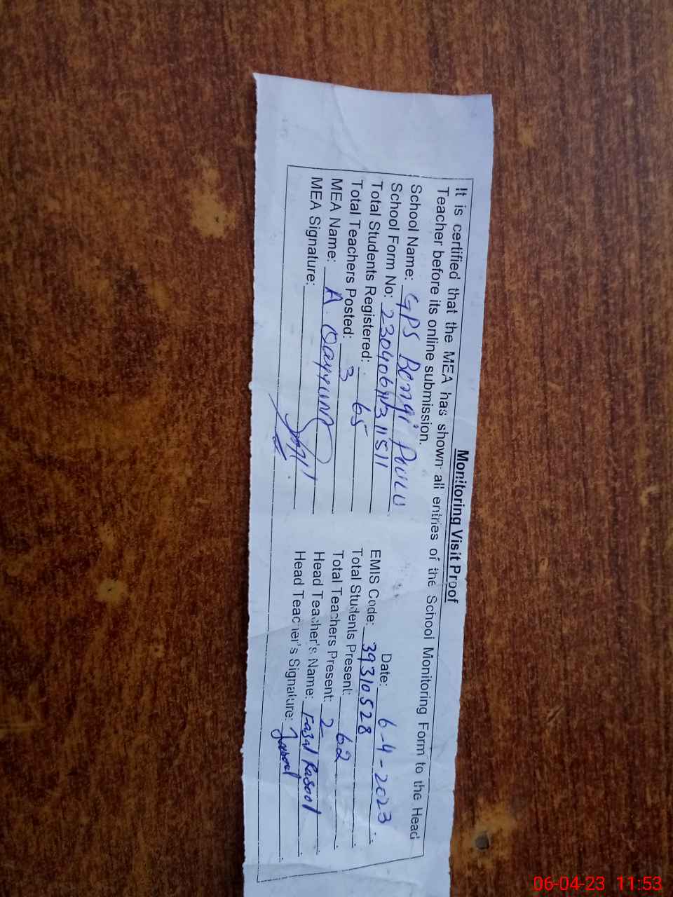 | Attendance Register | Head Teacher | MEA with School | Visit Proof |