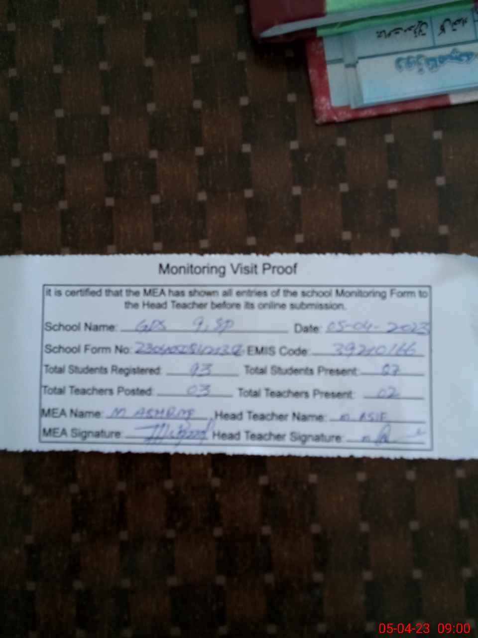 | Attendance Register | Head Teacher | MEA with School | Visit Proof |