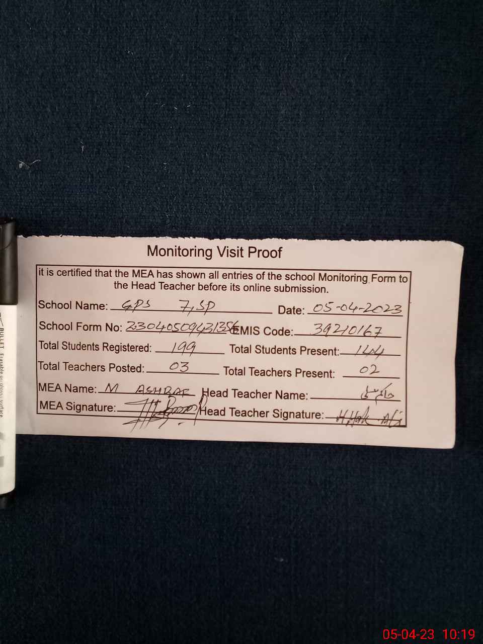 | EMIS Code: 39210167 | Name of School: GPS 7 SP PO MOLVI WALA PAKPATTAN | |||