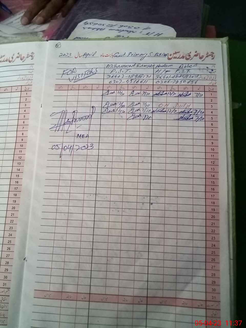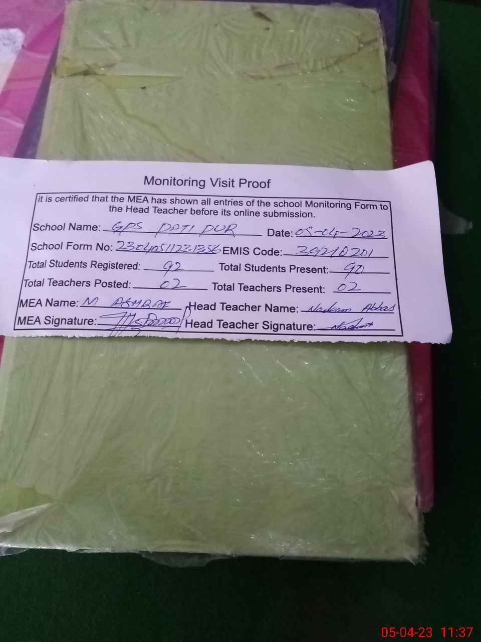 | Attendance Register | Head Teacher | MEA with School | Visit Proof |