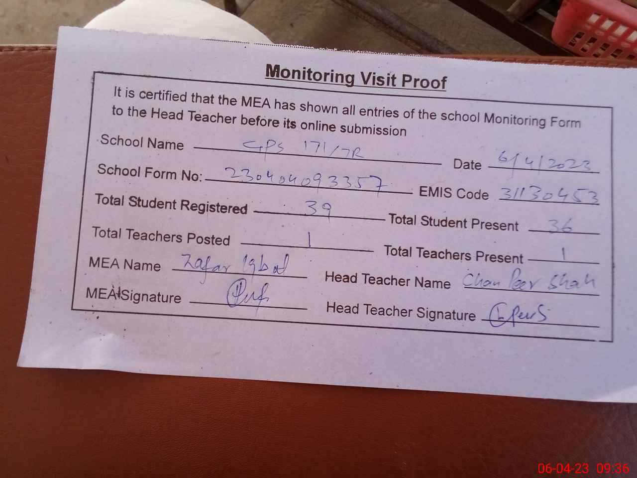 | Attendance Register | Head Teacher | MEA with School | Visit Proof |