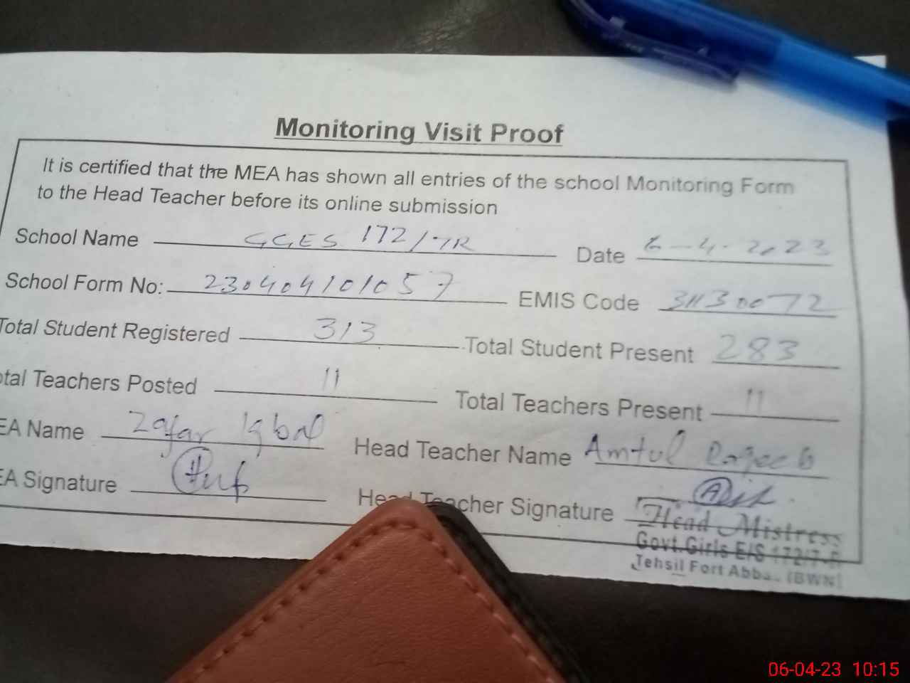 | Attendance Register | Head Teacher | MEA with School | Visit Proof |