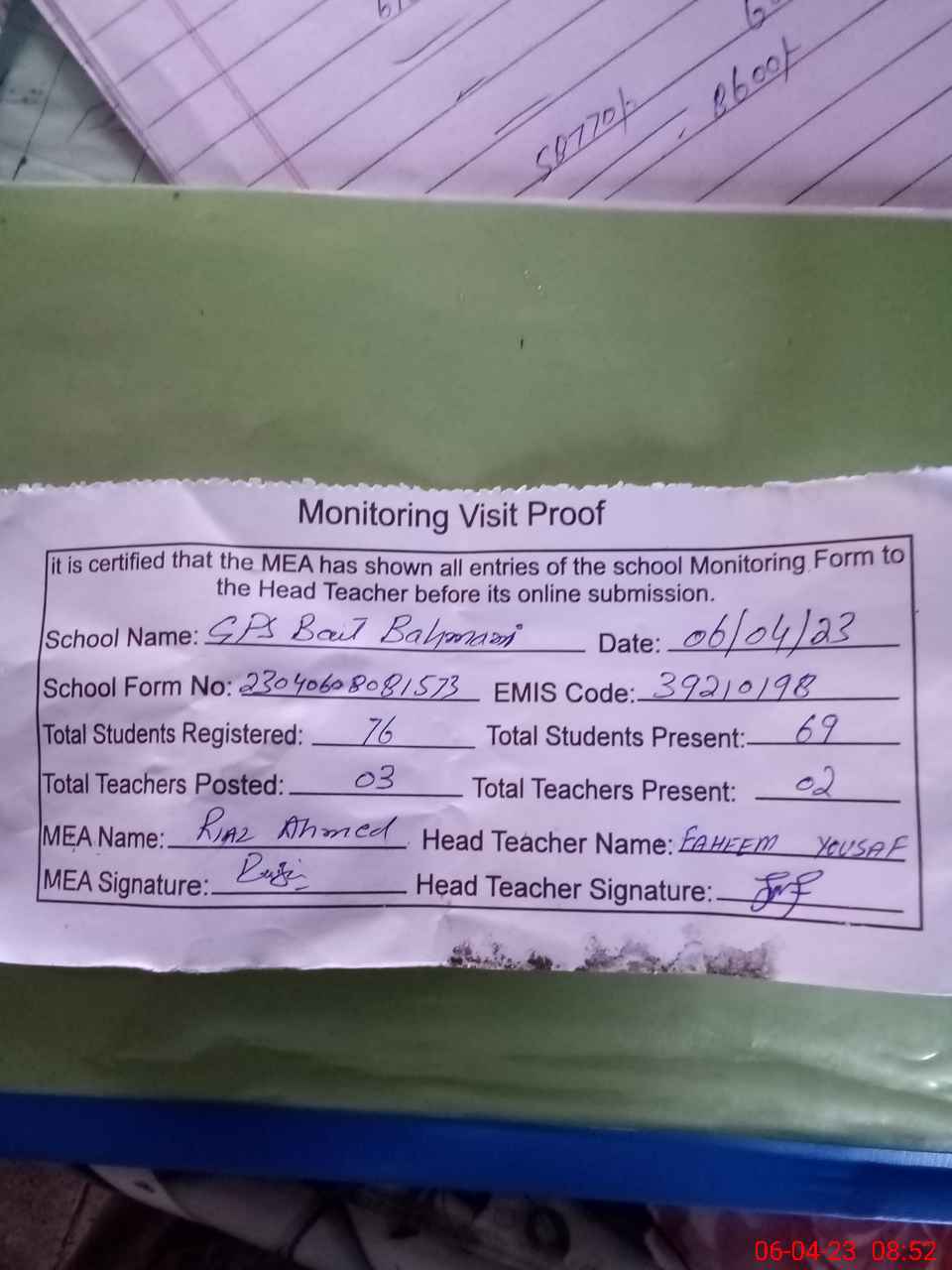 | Attendance Register | Head Teacher | MEA with School | Visit Proof |