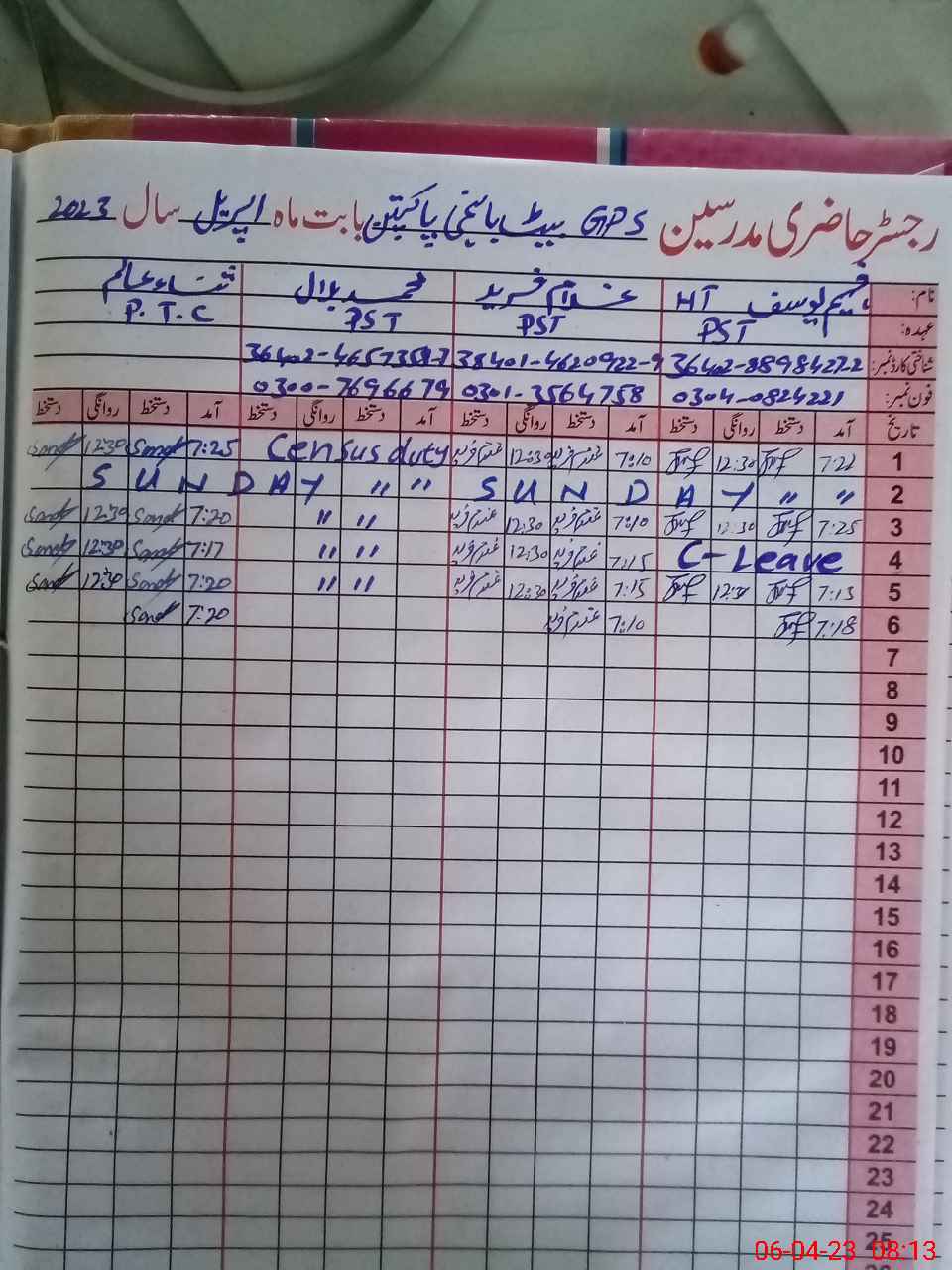 | CNIC | Full Name | Designation | R/C | Absence During Last Calender Month |