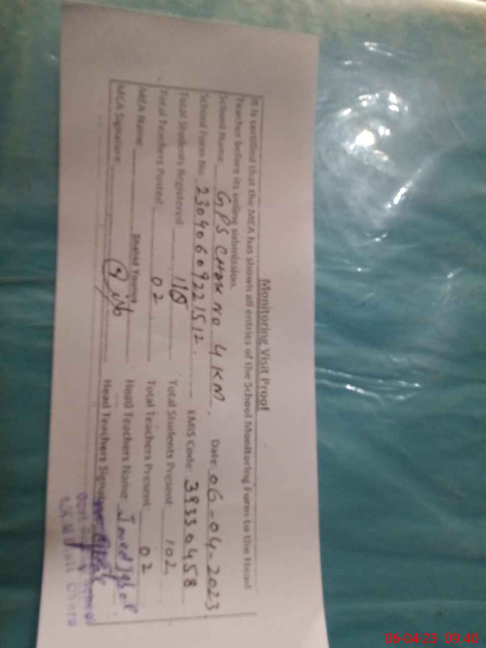 | Attendance Register | Head Teacher | MEA with School | Visit Proof |