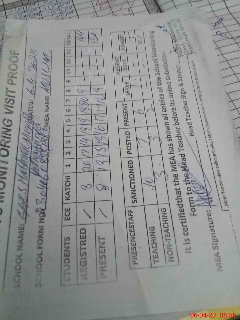 | Attendance Register | Head Teacher | MEA with School | Visit Proof |