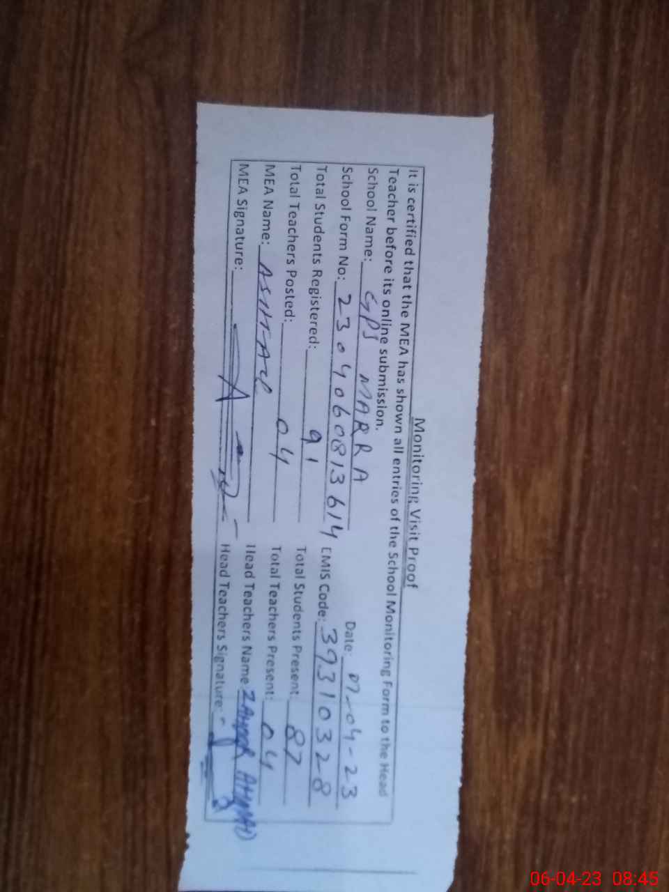| Attendance Register | Head Teacher | MEA with School | Visit Proof |
