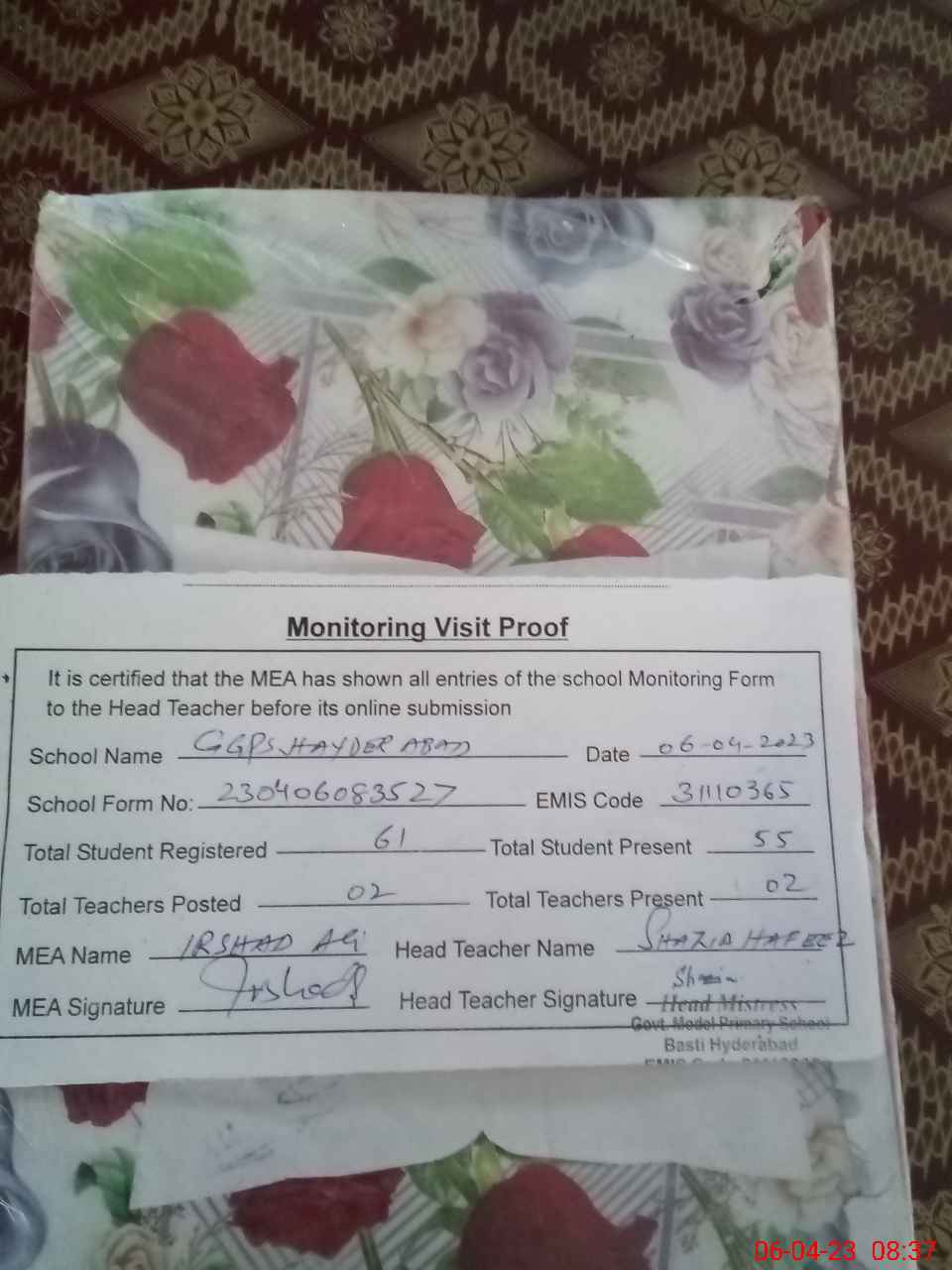 | Attendance Register | Head Teacher | MEA with School | Visit Proof |